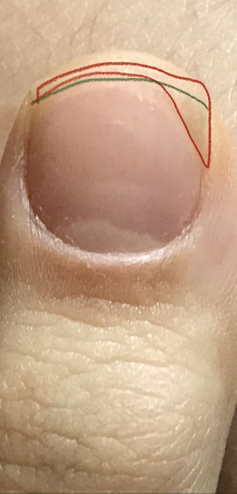 빨간색-손톱 노란부분 초록색-원하는 모양 내가 손톱물어뜯는버릇 고치다가 기르는데 너무 바디가 이상해... 손톱 깎으면서 기르는데도ㅠㅠ