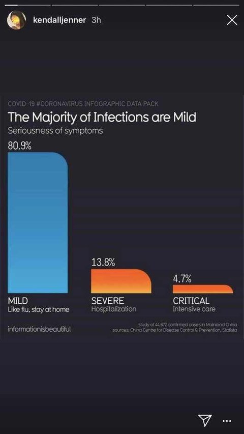 켄달 무식 그 자체. 그동안 인스타로 멍청한거 티 많이 났는데.. 이번에 코로나바이러스 미국에 퍼지기 시작할 때 인스타 스토리에다가 코로나 증상 대부분이 독감 정도로 마일드 하다고 = 가볍다고 올림. 그 때 이미 유럽은 사망자 엄청 많고 이탈리아는 집 밖으로 외출도 거의 못 하는 상태였음. 공인이 올린 확실하지도 않은 정보가, 미국 사람들이 초기에 별거 아니라고 여기는데 영향을 줬겠지. 지금 미국 감염자만 40만 넘고 사망자 14000명임. 경각심 줘도 모자를 때에.. 모르면 걍 가만히 있던가..