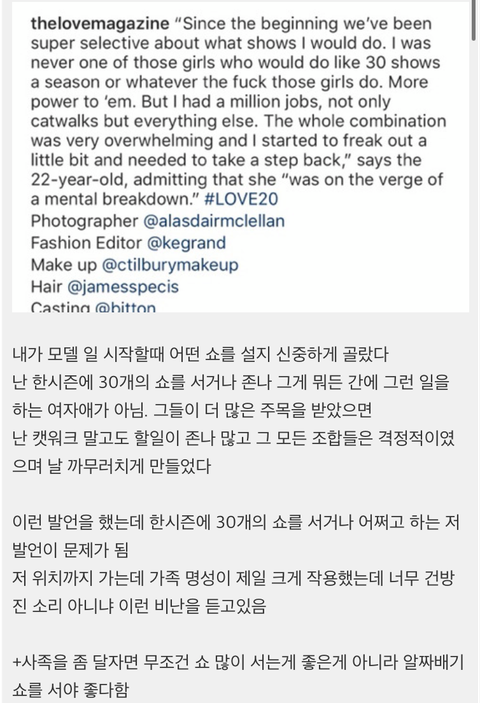 켄달 집안빽 조지게 받아서 낙하산으로 탑모델 된 주제에 심지어 노력도 안하고 워킹도 일반인수준도 못그치면서 맨날 인터뷰할때마다 자기가 훌륭한 직업정신이 있는척, 자수성가한척, 지 위치에 있는게 오로지 지 노력으로만 이루어진거인척 지리는데 그럴때마다 미국 사람들이 ㅈㄴ 꼴보기 싫다 그러다가 결국 이 인터뷰로 비호감이미지 확 생성되고 같은 탑모델들도 저격하면서 욕함 ㅋㅋㅋㅋ 지가 생각하는 그 아무 쇼도 니 집안이 안그랬다면 널 미쳤다고 써주겠냐 ㅉ 심지어 이 다음에 욕 오지게 먹고 뭐라도 말은 해야겠으니 글을 썼는데 사과문도 아니고 나에게 더 친절하게 굴어달라 ㅇㅈㄹ해서 결국 끈 잡고 있던 팬들도 떠남 이런거 말고도 무식한 발언들 숨쉬듯이 하는 애니 얘 예뻐서 빠는 애들은 얘만큼 몸매 예쁜 모델 빅시에 널리고 널렸으니 걔네로 대체해