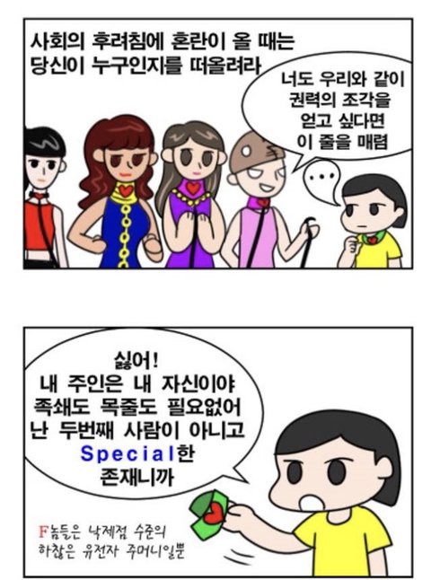 여성이 남자랑 번식해주지 않고 연애해주지 않고 결혼해주지 않고 코르셋을 벗는다면 가부장제는 없어진다. 그거면 되냐고? 응 그거면 된다. 안하는 사람때문에 안되는거지