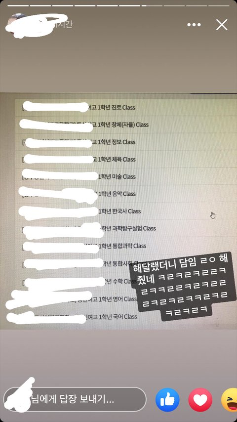 아직 학교 가보지도 않았는데 선생님 농락 ㅈㄴ하고 (저 사진도 스노우로 얼굴 늘리는 필터) 만나보지도 않은 담임 선생님 욕 맨날 올리고 진짜 생각 없는 거 티냄..