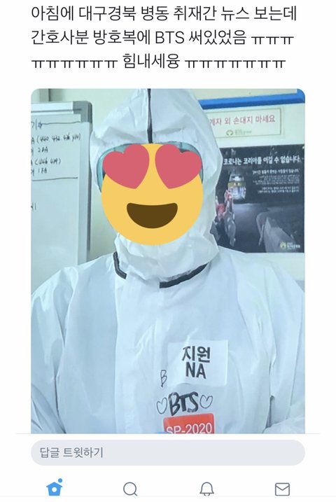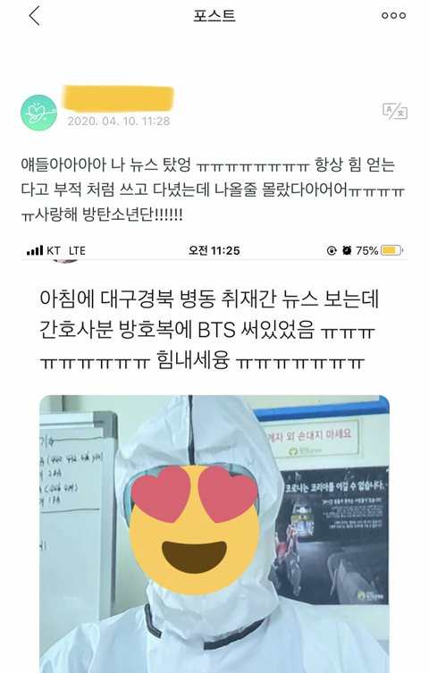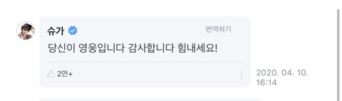 자랑스러워서 올릴래ㅜㅜ 이분 너무 자랑스러워 대구경북 간호조무사분이 위버스에 글올리셨는데 슈가가 댓달아줌 참고로 이분 최애 슈가임ㅠㅠㅠㅠㅠㅠㅠ 너무 고생하십니다 진짜