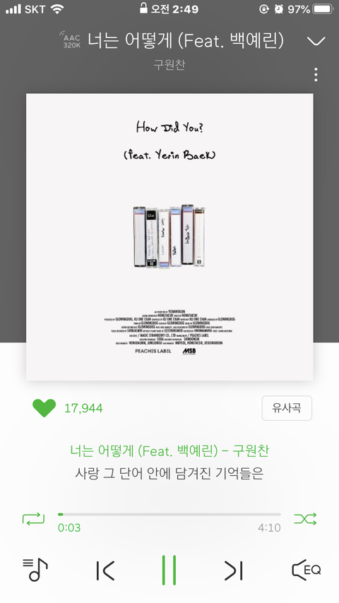 이 노래는 걍 눈물뽑고 싶을 때 들으면 좋아 특히 힘들 때 들으면 눈물 주륵 흐를듯 원래 위로해주는 노래를 좋아하진 않는데 이 노래는 예외일 정도로 좋아ㅜㅜ 노래 자체가 너무 좋아서 계속 듣게됨 꼭꼭 들어주길