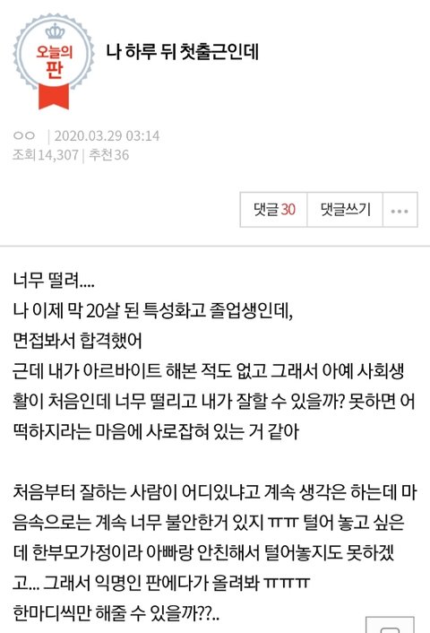 나름대로 첫 출근하고 공부도 하고 일도 하느라 바빠서 다 너무 좋은 조언들 남겨주셨었는데 답글을 못달았어요 ㅠㅠ...첫 출근 많이 떨렸는데 막상 가서 인사하고 나니 별 거 아니더라구요 ! ㅎㅎㅎ 아직 회사 들어가기 전에 쉼호흡 한 번 하고 들어가긴하는데 ㅎㅎ 여러분들 응원 덕분에 같이 일하시는 분들 다 너무 좋으신 분들 밖에 없어서 약간 축복 받은 기분이에요 ㅠㅅ ㅠ