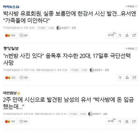 n번방 제발 자기 마음대로 죽지마, 끝까지 살아서 피해자들 원망 받으면서 빌빌 기어야지. 제발 편하게 죽을 생각도 하지마, 너네 몸에도 애벌레 기어다니고 몸에 칼로 새겨봐야 정신을 차리지.