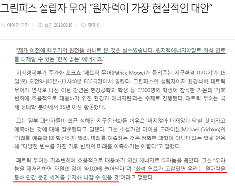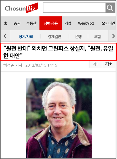 2012년에 그린피스를 창설한 창설자가 원전을 반대하는 시위를 주도하다가 나중에 입장을 바꿨던 사건이 있어.
