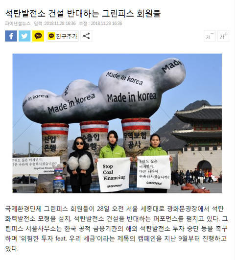 그런데 한국의 그린피스는 원전 반대에 그치지 않고 이번엔 또 석탄 발전소까지 반대를 함ㅋ 재밌지?ㅋㅋㅋㅋㅋㅋ