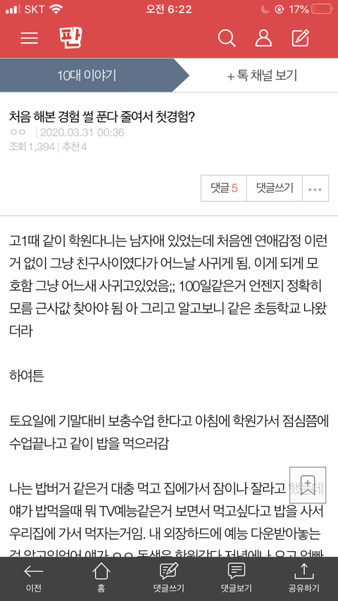 고1때 같이 학원다니는 남자애 있었는데 처음엔 연애감정 이런거 없이 그냥 친구사이였다가 어느날 사귀게 됨. 이게 되게 모호함 그냥 어느새 사귀고있었음;; 100일같은거 언젠지 정확히 모름 근사값 찾아야 됨 아 그리고 알고보니 같은 초등학교 나왔더라