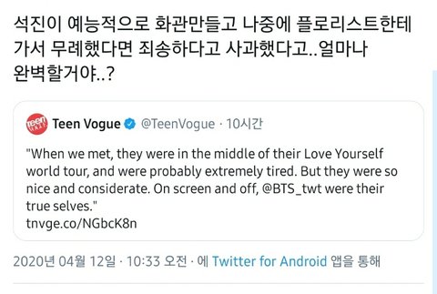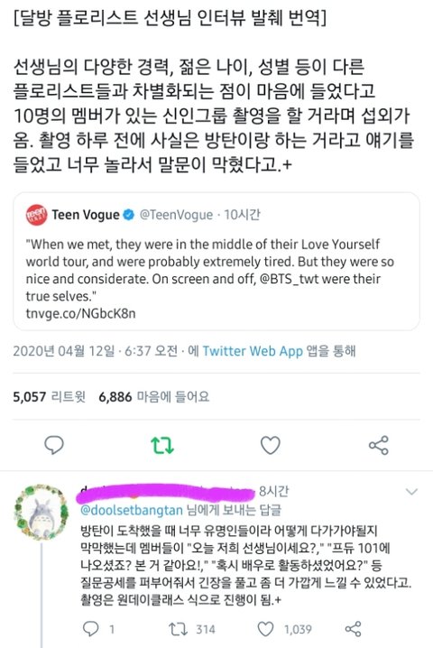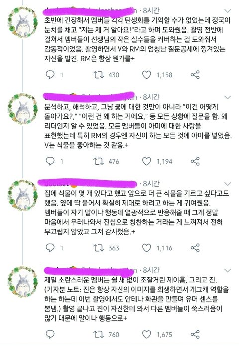 teen vogue에서 '달려라 방탄'에 출연하신 플로리스트 분과 인터뷰를 했음. 사진에 나온 것처럼 일화를 풀어주셨는데, 읽어보면 방탄은 얼마나 착하고 좋은 사람인지 알 수 있음