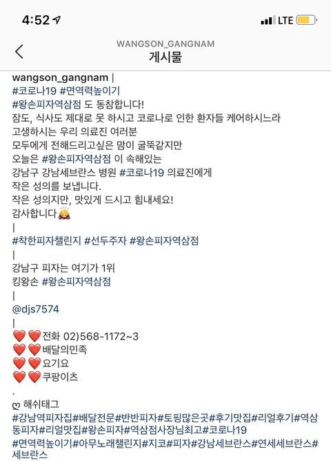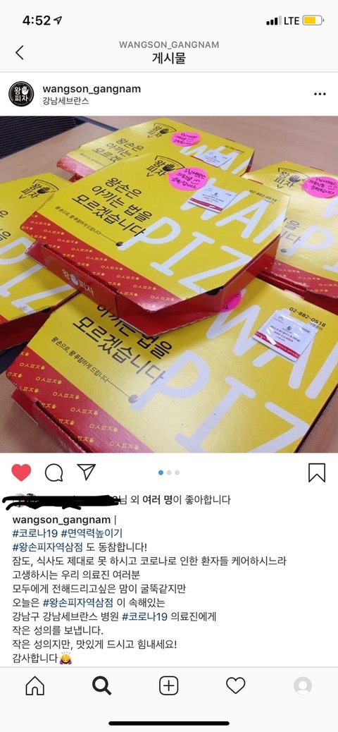 강남세브란스 다니는데 요즘 코로나19때문에 개빡세거든ㅠㅠ요즘 너무 바빠서 또 내가 애기엄마라 사람들 많은데 가는게 넘 꺼려져그래서 밥먹는것도 거르거나 출근하면서 편의점에서 샌드위치 같은걸로 떼운지 몇달째였거든근데 근처에 배달피자집인거같은데 코로나때문에 힘든 의료진들 응원한다면서 간식이라며 피자를 배달해주셨어....ㅠㅠ병원 외부인 출입이 금지되있어서 직원분 직접보내주셨는데 밖에서 다른직원이랑 같이 받으러 내려갔거든 진짜 너무 감사했어.. 대기업들도 안하는 건데 이렇게 작은 배달피자집에서 이런 생각했다는게 진짜 아직 우리나라 살만한거같더라구 양이 적든많든 상관없이 너무 고마웠지모야이렇게 그냥 넘어가기엔 아까워서 다들 알려주고싶었어인스타에 올리시긴 했던데 나도 홍보해드리고싶었어 ㅋㅋㅋ