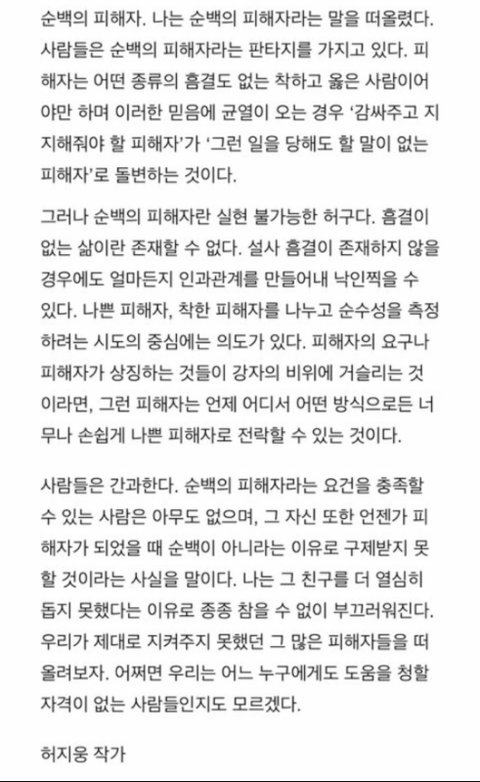 물론 피해자가 잘 한 건 아니야. 저런식의 대가도 옳지 않고, 근데 지금 N번방 가해자에 대한 합당한 처벌이 뚜렷하게 나오지 않은 상황에서 화살을 피해자에게 몰아가는게 잘못된거지. 이런 식으로 피해자가 언급되는건 N번방 가해자에게 정당화하려는 거 아니야? 피해자가 뭘 했든, N번방의 피해자가 아닌 건 아니잖아. 피해자에 대해 언급하고 싶으면 n번방 사건이 마무리된 후에 논의하라고