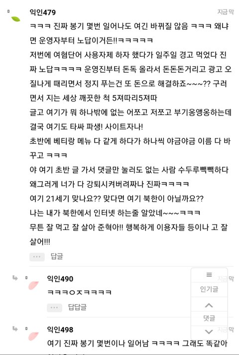 나 인티 눈팅하는데 농민봉기 하듯이 인티 회원들 억울하게 쓰기 차단 당한 경험 푸는 (쟤네들은 북한에 살아서 경고받은 사유 말하는 것도 경고 사유고 우습게도 이 글은 엄청난 용기를 낸 글...^^) 글 올라온 지 1시간 정도밖에 안돼서 댓글 400개 달린 핫플이었음