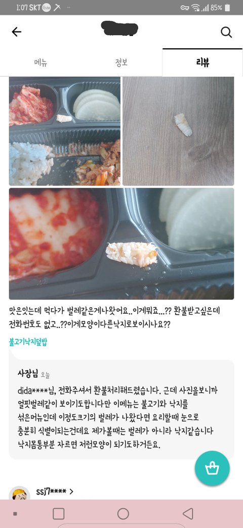 저도 예전에 주문해서 먹을때 저런 기생충 나와서 사장님한테 전화 드렸더니 사장님이 직접 집으로 찾아오셔서 죄송하다 사과하고 앞으로는 실수없이 철저하게 관리한다고 하셨고 그 뒤로 나온적 없네요. 이건 사장님 태도가 문제인듯