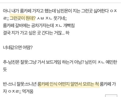 아니 내가 룸카페 가자고 했는데 남친몬이 지는 그런곳 싫어한다 ㅇㅈㄹ;; 그런곳이 뭔데? ㅅㅂ ㅈㄴ 웃기네;;