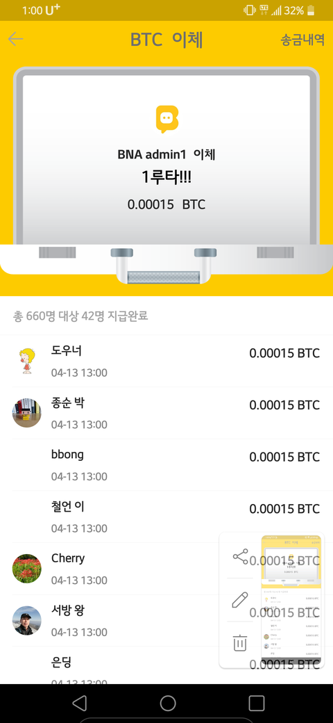 [수익인증] 바나나톡! 만루홈런 1BTC 에어드랍 이벤트