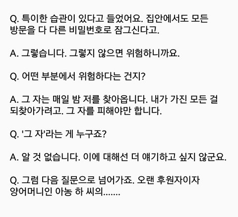 알 수 없는 암호. 9자리의 빈칸. 침실의 비밀번호로 추정된다.