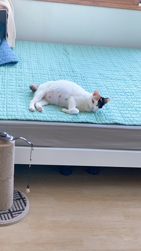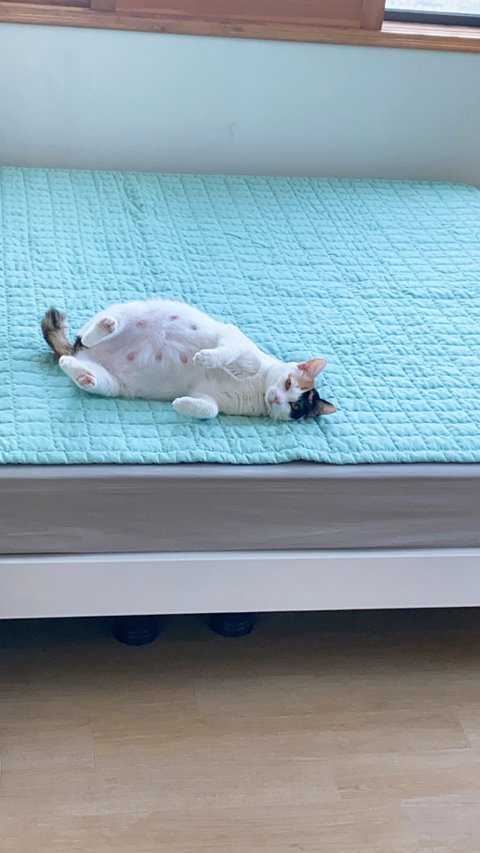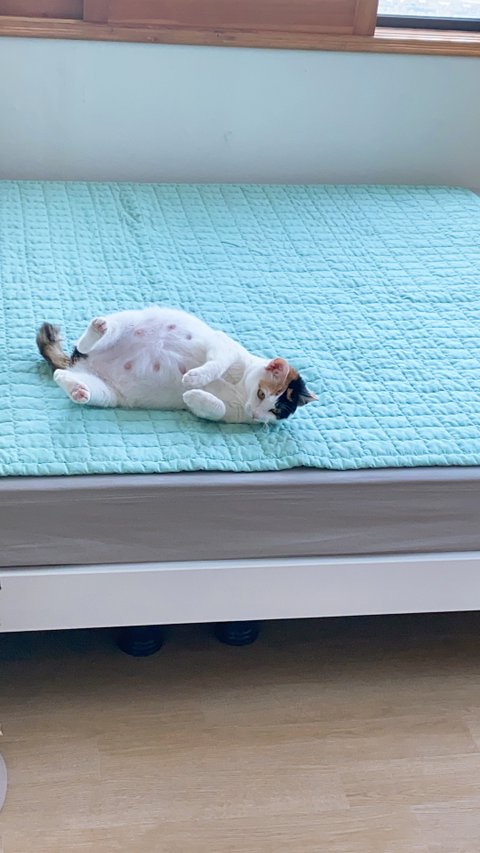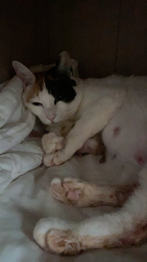 엉덩이쪽 다쳐있는아기 냥줍한지 4개월정도네요 ㅎㅎㅎ 고양이가아니고 개냥이에요 ㅠㅠㅠ 애교도 많고 처음 집사 해보는거지만 그래도 집 들어가는 이유가 돼주네요~~ 2월9일날 외박하고 오더니 일요일새벽 아기를 낳았습니당! 초산이라서 1마리 새끼밖에 빛을 못봤어요... 6마리중에 5째라서 이름은 오복이입니당