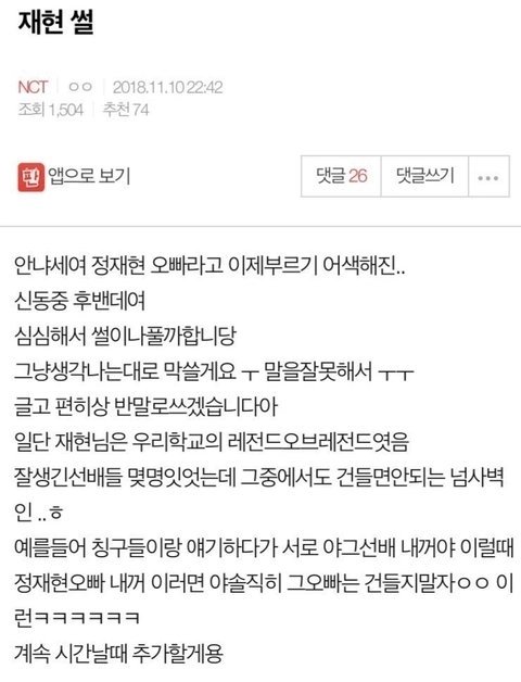 똘추시티즌이 트페미짓하는거보다 저런 머글 호감이 도움인데 댓글 몇몇들은 엔시티 성격 궁예로 망치는 까빠똘추들한테 물들어 돌았나 재현이한테 피해주지말고 ㄲㅈ 그리고 재현 인스타 유입도 게시물 수대비 역대급이래 좋아요 평균 100만 좋아요 140만이상임 팔로 천만대랑 비슷하대 ㅇㅇ트페미보다 페북 인스타 머글 호감도가 넘사아이돌한테 도움임 트위터에서 까빠짓하는 느그가 도움 안됨