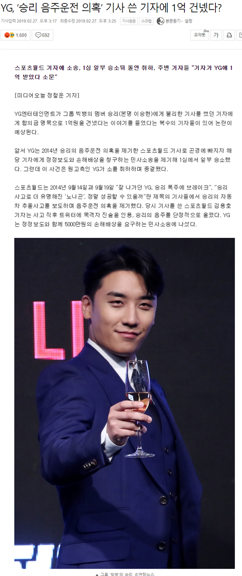 댓글에 빅뱅팬 되게 웃긴다 승리랑 선그으면서까지 챙길 이미지가 남았다고 생각하는건가..