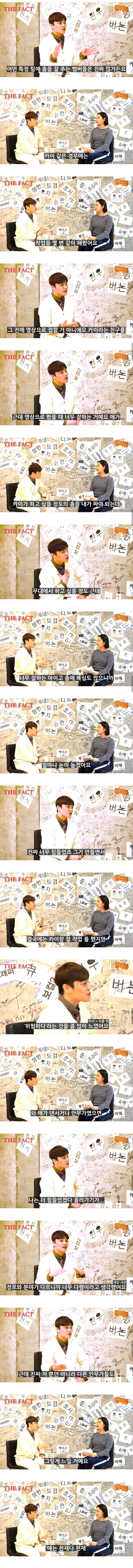 어떤 안무가가 연말 시상식 초대권이 생겨서 갔는데 본인은 직업이 안무가이지 어떤 가수의 팬은 아니었대 2018년도면 엑소는 연차도 쌓이고 카이는 이미 춤으로 인정받는 아이돌인데 정말 몸이 부서져라 열심히 춤추는 것보고 감동 받았대 부끄러워서 반성하게 만든다고