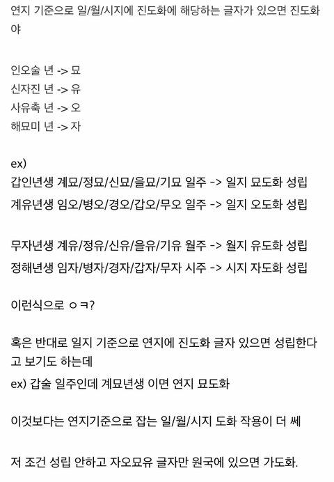 딱 이거임 자오묘유 있다고 진도화 ㄴㄴ 뭐 딴 말로 천간이 을 정 신 계 면 도화끼가 있다고 보긴 하는데 확실한건진 모르고.. 재미로 봐