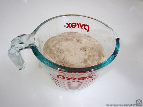 여기에 설탕 한 테이블 스푼을 넣고 이스트 한 봉지를 섞어서 거품이 잘 올라오는지 살핍니다.