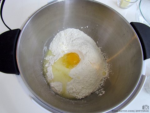 활성화된 이스트를 보울에 붓고 밀가루와 달걀, 그리고 소금 약간을 섞어줍니다.