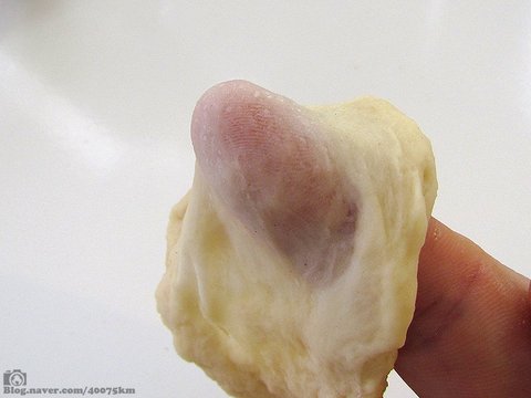 반죽을 죽죽 늘려 펴서 손가락을 대 봤을 때 지문이 비칠 정도로 얇게 펴지면 됩니다.