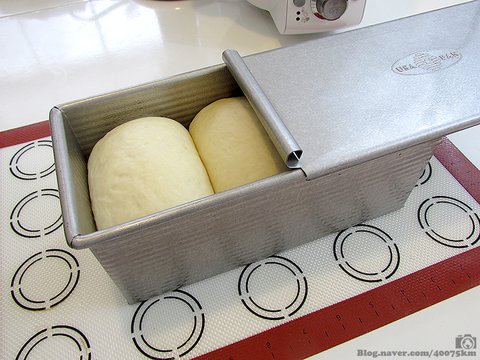 성형이 끝난 반죽을 식빵틀에 넣고 2차 발효를 합니다. 대략 30분 후에는 틀의 7~80% 높이까지 부풀어 오릅니다.