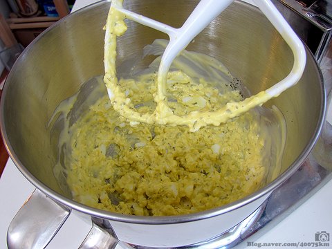 손으로 으깨기도 하고, 숟가락이나 포크로 으깨기도 했지만 결국 제일 맛있는 결과물은 반죽기로 단시간에 으깨며 섞는 거라는 결론에 도달했습니다.