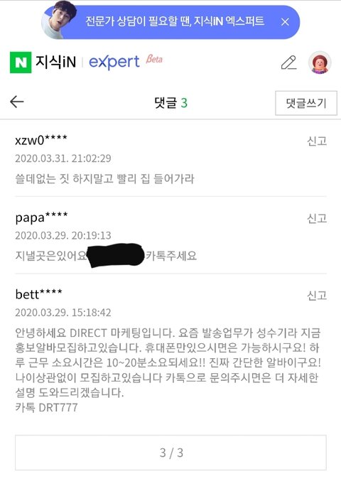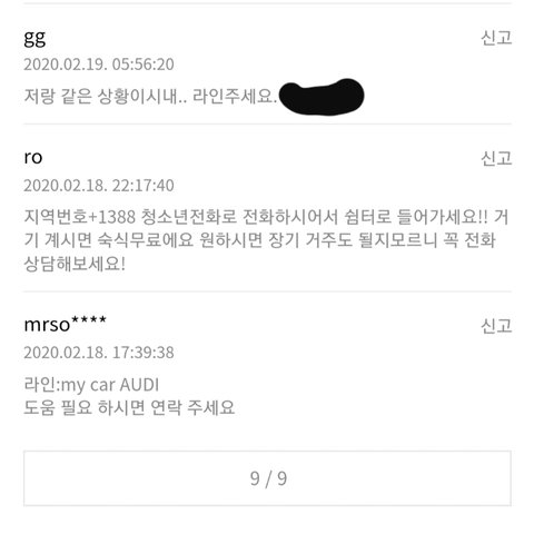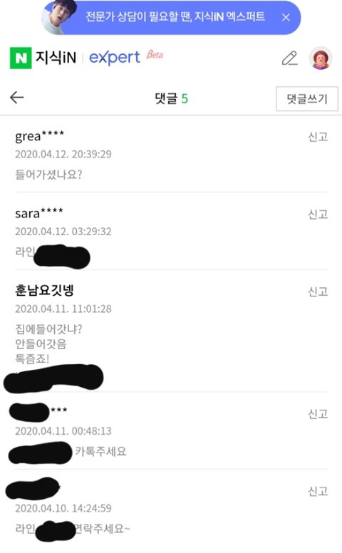 요즘 가출생각나서 지식인에 '가출'쳐서 게시글 보고있는데 댓글이나 답변보면 거의 다 저런거는 꼭 있음;; 특히 여자라 밝히면 더 많음..(남녀갈등 조장 아님. 나도 남자임) 남자라고 밝힌 글에는 별로 없고..ㅋㅋ 진짜 미친놈들인가? 가출청소년들 만나서 거시기뽕알딸랑딸랑 좀 해볼라고 저러는건가ㅋ 진짜 개역겨움; (물론 저 중에서도 몇 개는 진짜 선의로 접근한 것도 있겠지만 대부분은 이상한 의도인듯함;)