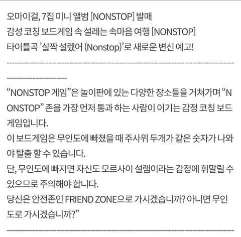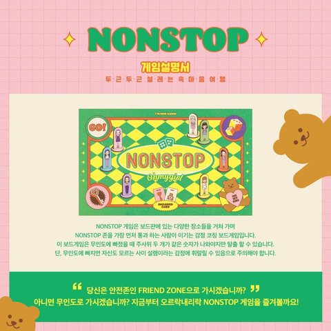 드디어 옴걸 8개월만에 미니7집 'NONSTOP' 으로 컴백! 아린이가 춤도 엄청 어려웠다고 하고 승희인가? 노래도 기대 이상이라고 해서 존버 중....