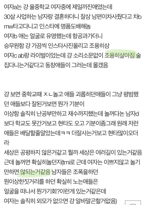 여자c ab랑 라이벌이었는데 걍 소리소문없이 조용히살아짐 술집다니는거같다고 동창애들이 그러는데 몰겠음