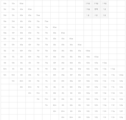 이런식으로 입어본 사이즈를 현재에 두고 그 사이즈가 작은것같으면 큼으로, 큰것같으면 작음으로 가면서 찾으면 됨. 이렇게 새로운 사이즈를 입어봤는데 그 사이즈가 또 크거나 작다면 그 새로운 사이즈를 현재에 두고 또 찾는거임. 브라입을땐 무조건 스쿱앤스웁해야함. 안하면 이표보고 사는거 아무 쓸모 없음.