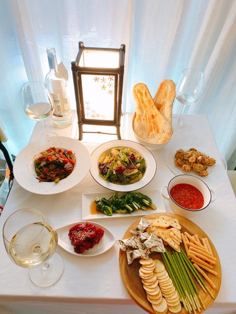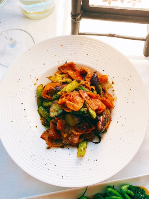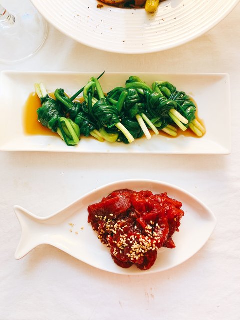 아스파라 거스 반 건조 토마토, 가지, 베이컨에 제노베제 소스, 굴소스로 마무리파묶음 무침& 육회