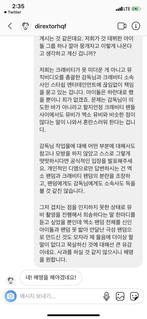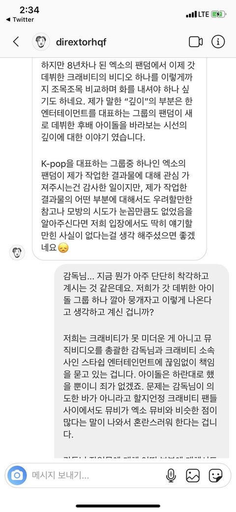 뮤비 감독은 엑소팬들만 유난이라는 발언을 한분께 했고, 엑소팬덤의 신인죽이기 및 견제라는 미친 발언을 함.