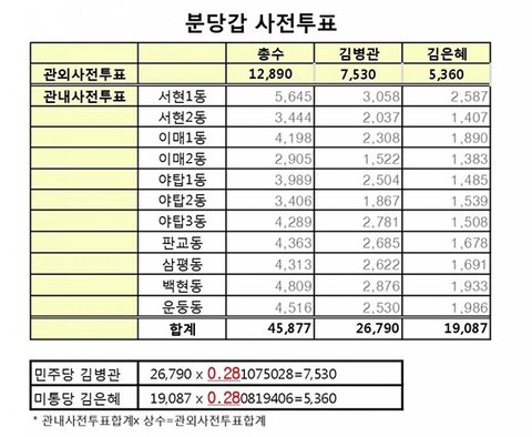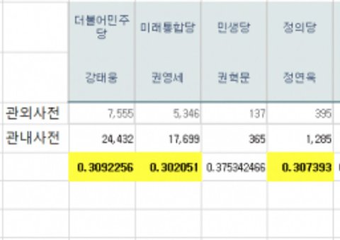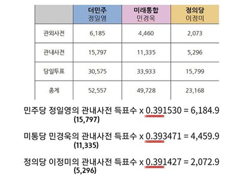 이미지를 보면 사전투표 중 관내투표 곱하기 특정 숫자가 관외투표의 숫자와 1의 자리까지 “정확히”일치한다. 프로듀스101 조작과 1도 상관없다.