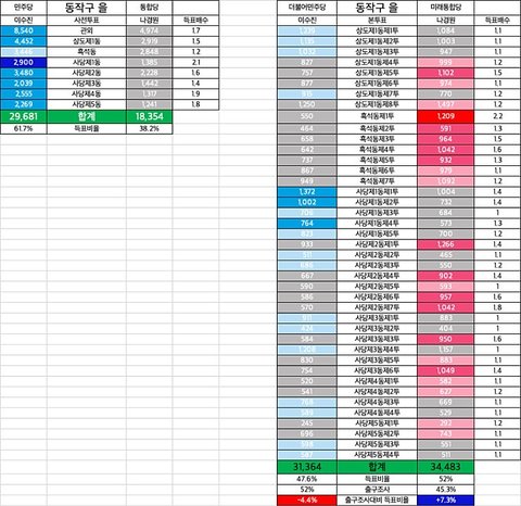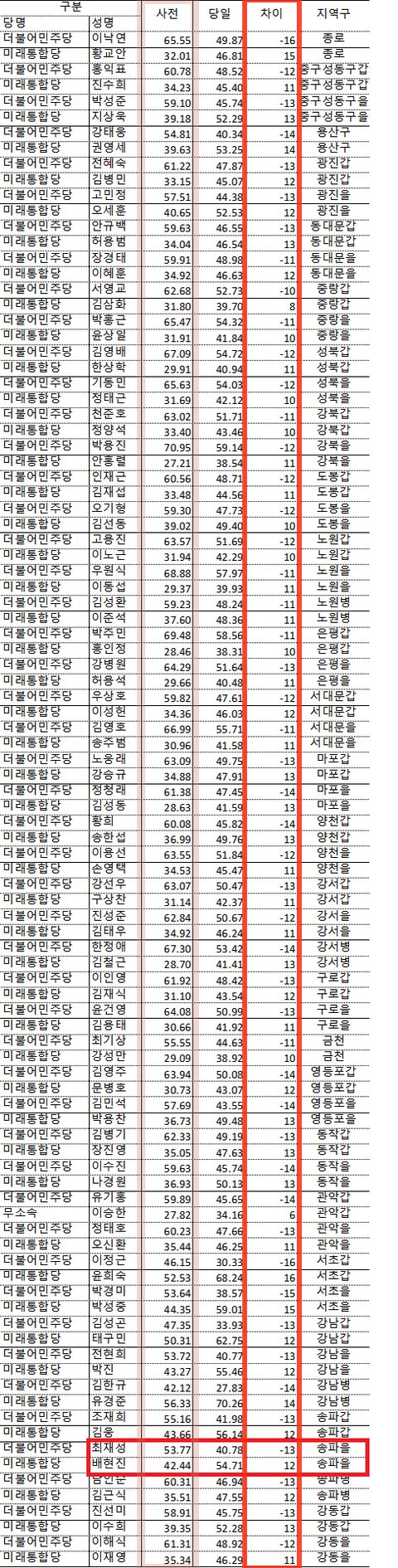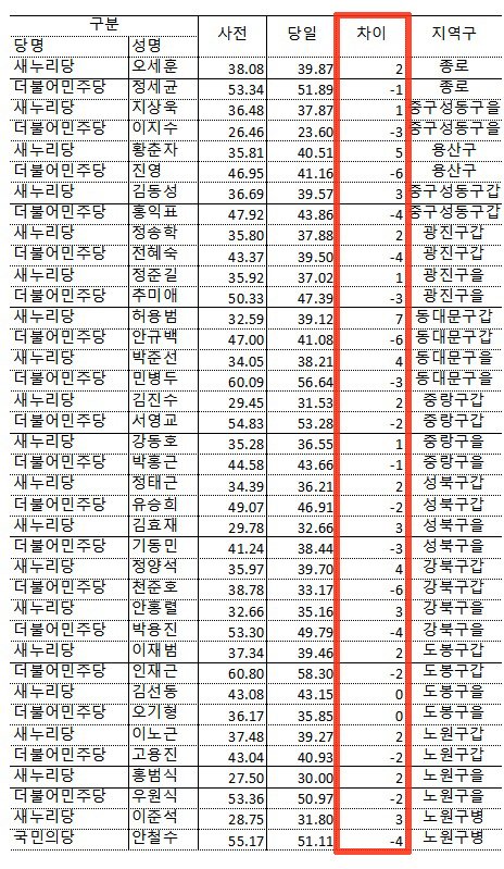 4년전 총선의 표를 보면 오차범위 이내인 2~7퍼센트이고 지역마다 편차가 있다.