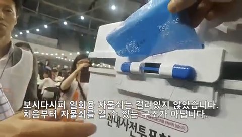 6. 이것은 2018년도의 선거 영상 캡쳐이다. 이미지의 모습은 투표함 봉인지 개봉전에 뚜껑을 살짝 들어본 모습이다. 자물쇠가 무늬만 자물쇠여서 뚜껑을 들어올릴 수 있다. 자물쇠가 장식용이고 전혀 자물쇠의 기능이 없다는 것을 알게 되었지만 당시 알려지지 않았다. 왜냐하면 별로 중요하지 않기 때문이다. 자물쇠가 무늬만 있던말던 아무도 건드리지만 않으면 될 것 아닌가.