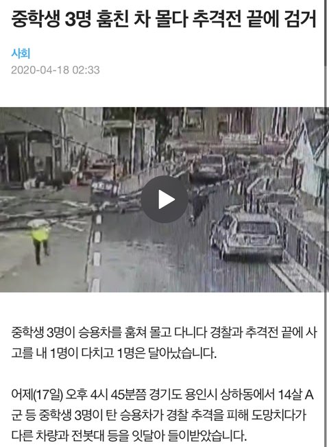 그 전에랑 다른 사건인데 차 훔쳐서 추격전 벌이다가 두명은 잡혔고 운전한 애는 도주해서 못잡았대 ;;;; 진짜 그런일이 있고도 저러고싶을까?? 알려지게 해줘 제발 쟤네도 천벌받아야돼 ;;;사람 쳤으면 어떡할라고 그래???