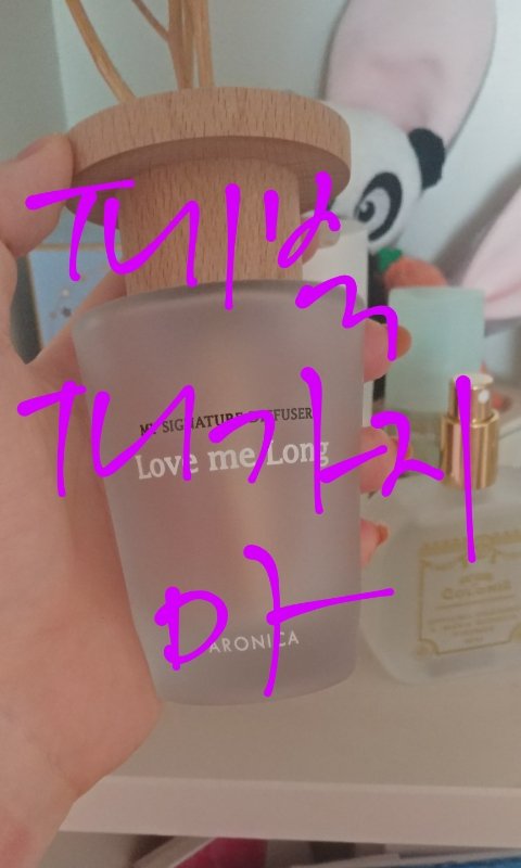 이건 페북 퍼가지마 디퓨전데 이름은 아로니카 러브미롱임 냄새는 사랑스러운 냄새임 좀 달달하고 페북 퍼가지마 음... 근데 달달한게 막 청포도, 복숭아 이런 달달한건 아님 냄새 개좋으니까 한번쯤 써봐