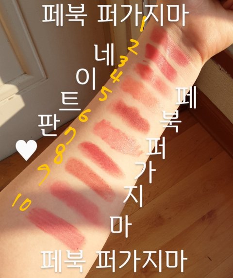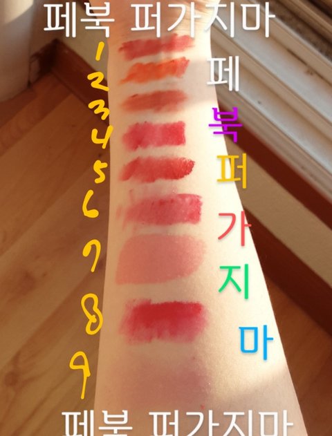 틴트 전체 발색하고 자연광에서 찍어봤어 필터 안입혀서 실제색이랑 거의 똑같음 페북 퍼가지망♥♥♥
