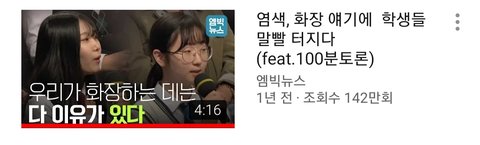 이 동영상에 나오는 사람들이 학생은 덜 성숙해서 학생이고 학생은 학생다워야 한다는데 성숙하는거는 개인차고 학생다워야 하는게 도대체 뭐냐고 사람들마다 다 기준도 다르면서 왜 그런얘기를 하지?그리고 토론이라면서 학생들 얘기하는데 웃어 ㅋㅋㅋㅋ 어이없노 학생들 화장이랑 염색보다 술담이랑 학폭이나 제대로 잡아라