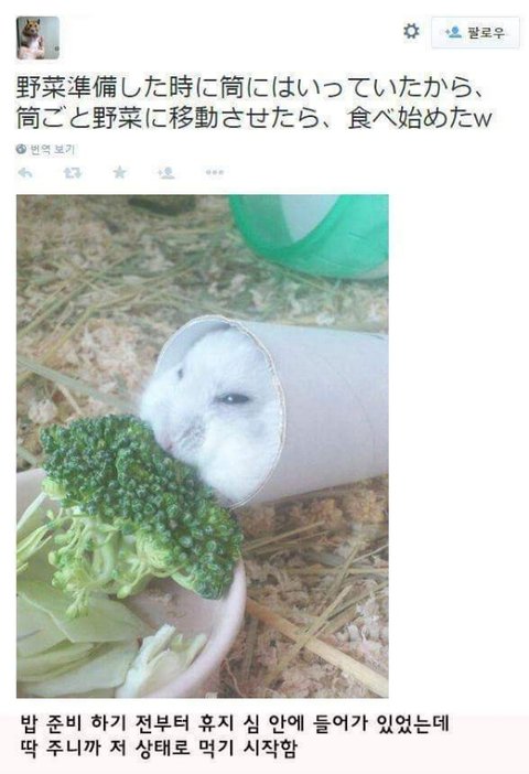 휴지심에 낀채로 브로콜리 먹는 쮜송이