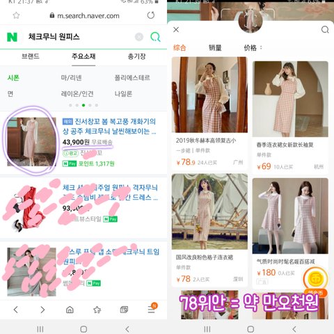 얘들아 내가 팁 줄게 걍 네이버에 사고싶은 옷 검색해서 좀 괜찮다 맘에 든다 싶은 제품 찾으면 캡쳐나 사진 저장해서 타오바오에 이미지 검색 해봐 그럼 똑같거나 비슷한 제품 나옴 SNS에서 공구한다고 올라오는 것도 검색하면 99% 다 나와 자체제작 아니면 백에 아흔아홉 다 타오바오 물건이거든 거기서 샵 등급 높고 후기 많은 곳에서 사셈. 예시로 그냥 네이버에 아무거나 검색해서 타오바오 이미지 검색 해봤어 이미지 참고해!! 근데 직구하려면 해외결제 가능한 카드 있어야하구 환율 그대로 적용하면 안되고 알리페이 카드수수료 3%에 카드사 수수료도 좀 나가니까 환율보다 쫌 더 넉넉하게 계산해야해!(ex. 환율이 175원이라면 그냥 180원이라고 생각하고 계산하는게 맘편해)