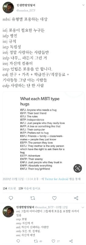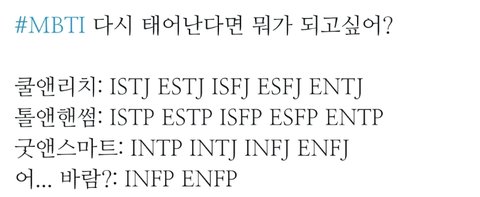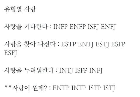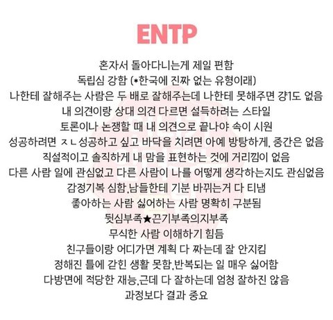 난 엔팁이고 원래 유사과학 별로 안좋아하는데 거의 4년째? 똑같이 엔팁 나오고 내 ㅂㄹ친구가 엔팁 설명? 그거 보자마자 니 그냥 엔팁의 인간화다 이래갖구 찾아보다가 진심됨 이제 엔팁 안나오면 좀 슬플지경;;