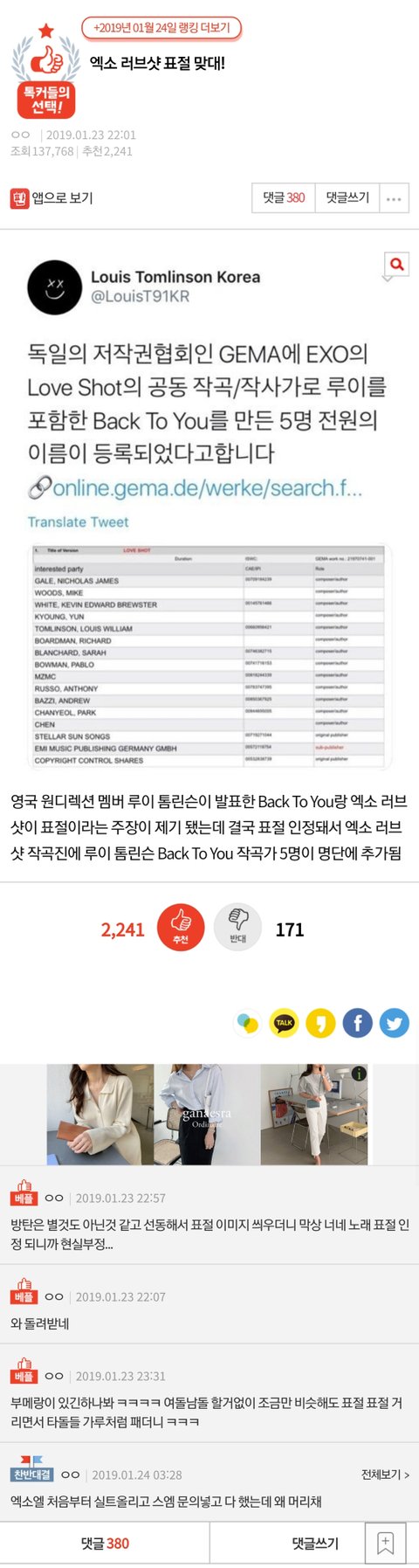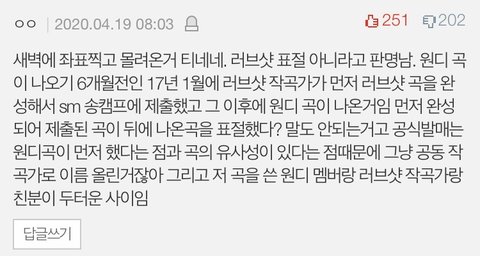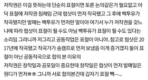 아 그리고 생각나서 적는건데 설령 ㄹㅂㅅ이 표절 맞다고 해도 루이 톰린슨한테 스엠이 공동작곡가 올려줄게 수익 배분 ㅇㅋ? 했으면 ㅇㅋ 하고 그냥 넘어갔을것 같음? 공동작곡가고 뭐고 바로 에스엠 소송했지 생각을 정말 조금만 해도.. 아니라는거 알수있음..^^