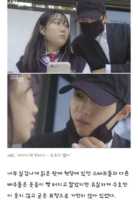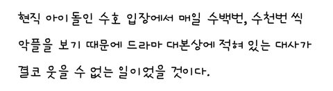 글고 저 드라마 자체가 개노답이었음 또 현직 아이돌 두고 저런 대사 치는데 웃는 거 예의 아니지않나 당연히 웃길 수는 있는데 수호를 주연으로 뒀으면 그만큼 좀 생각을 해야지ㅋㅋㅋㅋ