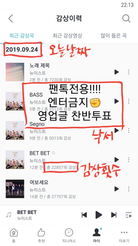 인증에는 ✔오늘 날짜, 온도, 음악감상 횟수 앞자리✔가 보여야 하며 "팬톡전용 엔터금지 영업글 찬반 투표" 낙서가 포함되어야 해