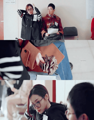 의대 면접을 앞두고 급하게 머리를 묶으려 하지만 머리끈이 없는 송화에게